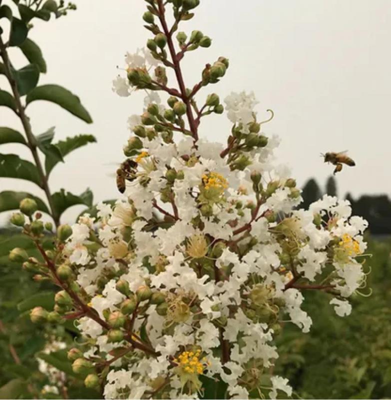 The Lagerstroemia x 'Natchez' is a deciduous tree known for its stunning, white flowers that bloom in the summer, creating a striking contrast against its dark green foliage. This variety is particularly appreciated for its vigorous growth and impressive height, often reaching up to 30 feet, making it a standout feature in any landscape.