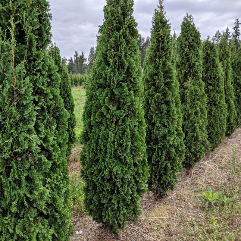 The Thuja o. 'Degroot's Spire', commonly known as Degroot's Spire Arborvitae, is a narrow, upright evergreen that adds structure and elegance to any landscape. This cultivar is particularly valued for its columnar growth habit, reaching heights of 10 to 15 feet while maintaining a compact width of only 3 to 4 feet. This makes it an excellent choice for tight spaces or as a vertical accent in garden designs.