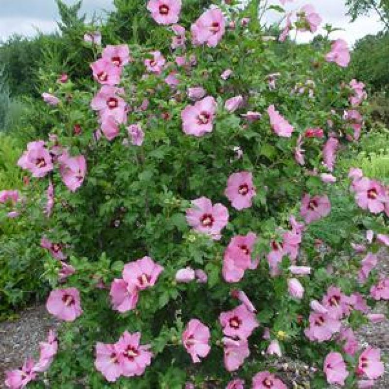 The Hibiscus s. 'Aphrodite' is a stunning shrub known for its large, showy blooms that can transform any garden space. This variety is celebrated for its striking soft pink petals that feature a deep red center, providing a beautiful contrast that attracts pollinators such as bees and butterflies.