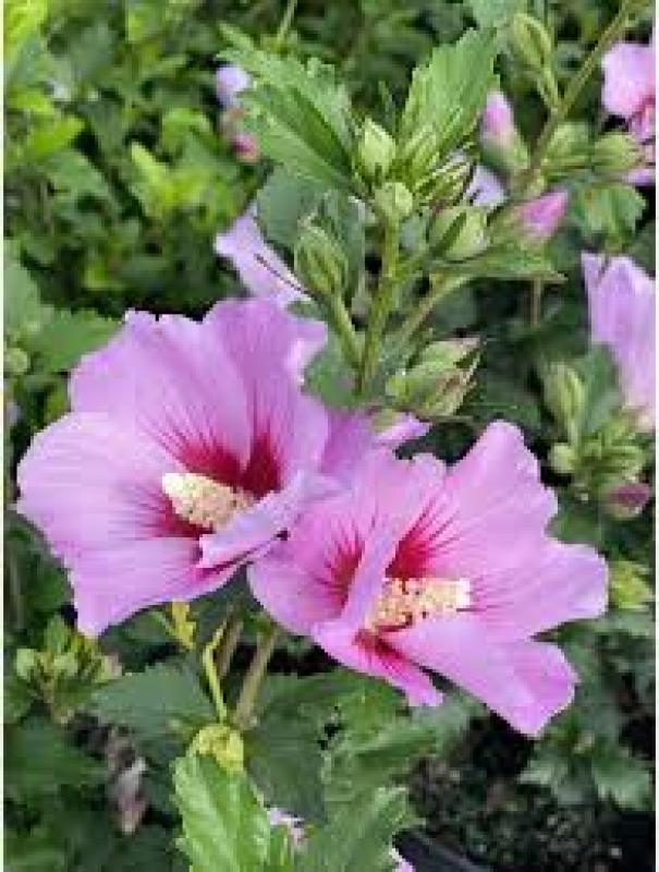 The Hibiscus s. 'Minerva' is a deciduous shrub known for its stunning, large blooms that add a vibrant touch to any landscape. This variety showcases delicate, lavender-pink flowers with a striking dark red center, creating a beautiful contrast that attracts pollinators such as bees and butterflies.