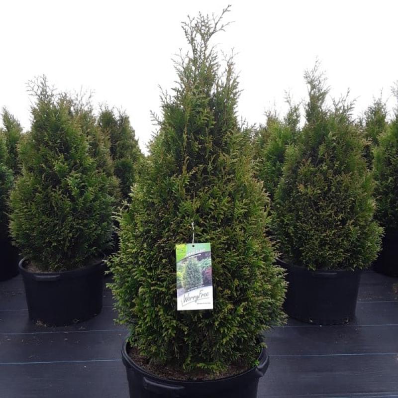 The Thuja p. 'Junior Giant' is a robust evergreen tree known for its dense, conical shape and vibrant green foliage. This variety is particularly valued for its ability to maintain a compact size while still providing substantial coverage, making it an excellent choice for privacy screens or as a focal point in the landscape.